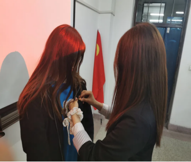 公布名单之后,两位老团员为新团员们颁发了共青团团徽,并为新团员代表佩戴团徽。